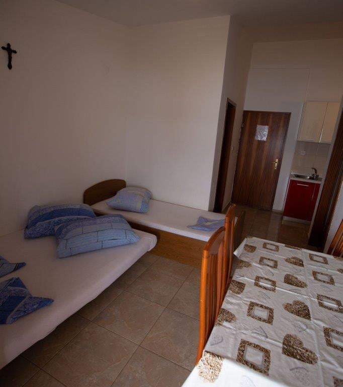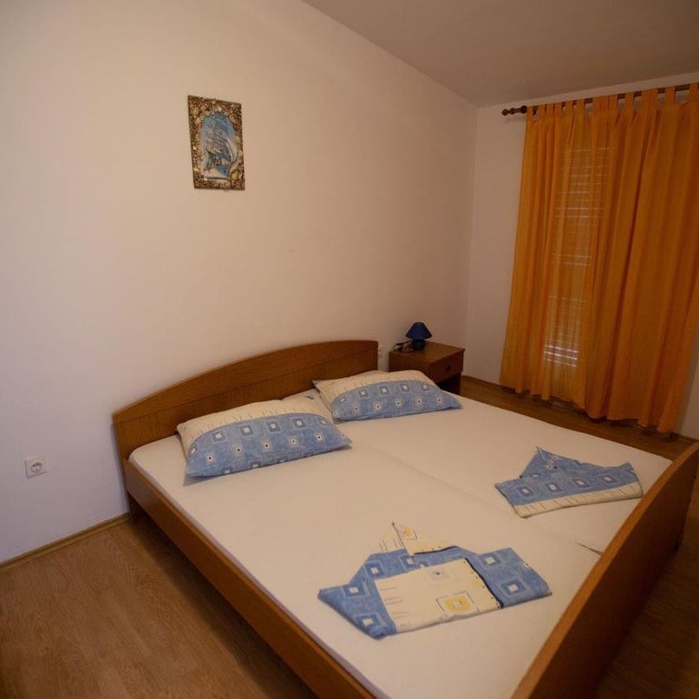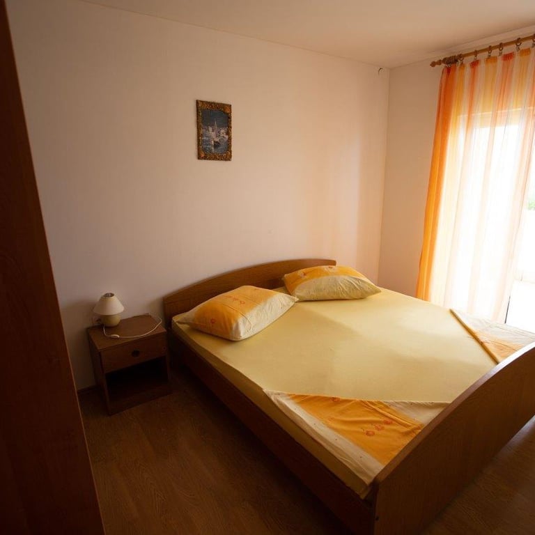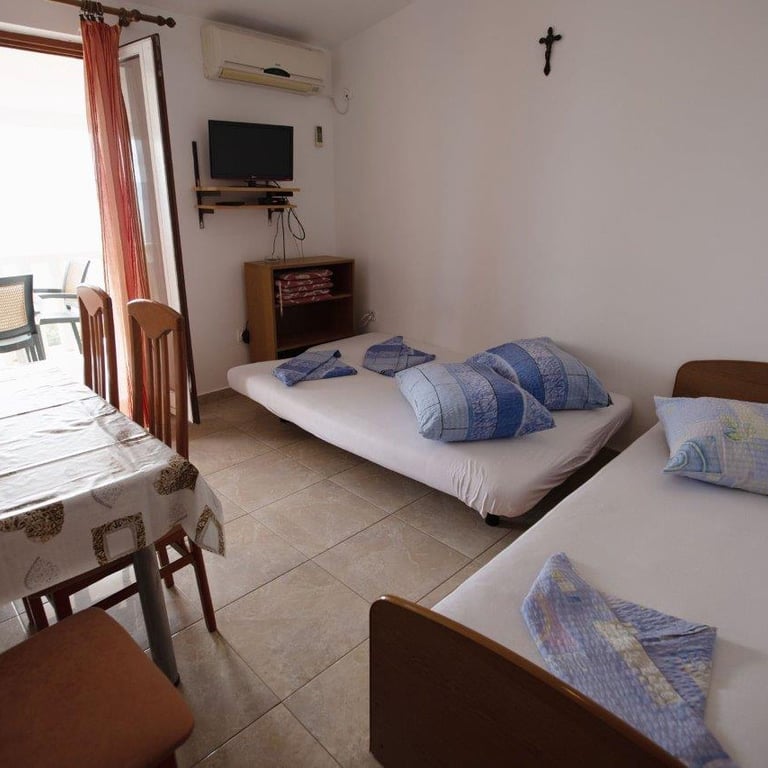 Located on the second floor, this apartment features a spacious bedroom with two beds and a living room with a kitchenette, which includes a sofa bed and an additional single bed. The balcony offers a comfortable seating area with a breathtaking view of the sea. The apartment includes a bathroom and a fully equipped kitchen with an electric stove, oven, 120L refrigerator, 10L freezer, microwave, and an electric kettle. Guests have access to glasses, dishes, cookware, towels, and all necessary kitchen utensils. The air conditioning is unlimited and free of charge. The apartment is available from 14:00 on the day of arrival until 10:00 on the day of departure. The price is fixed per night for the entire apartment, regardless of the number of guests, and it includes air conditioning, hot water, electricity, internet, and tourist tax, with no additional or hidden costs