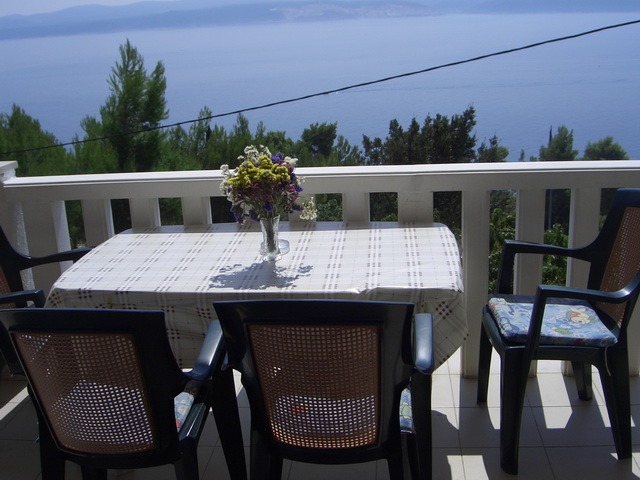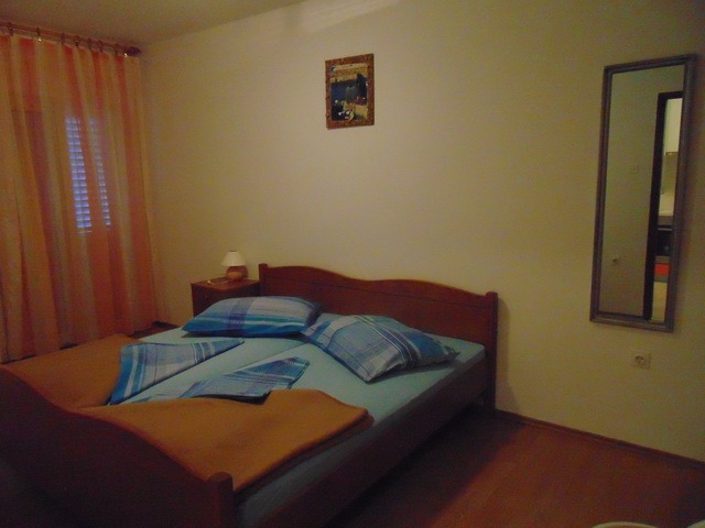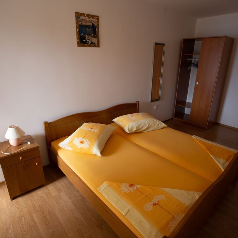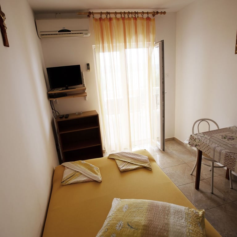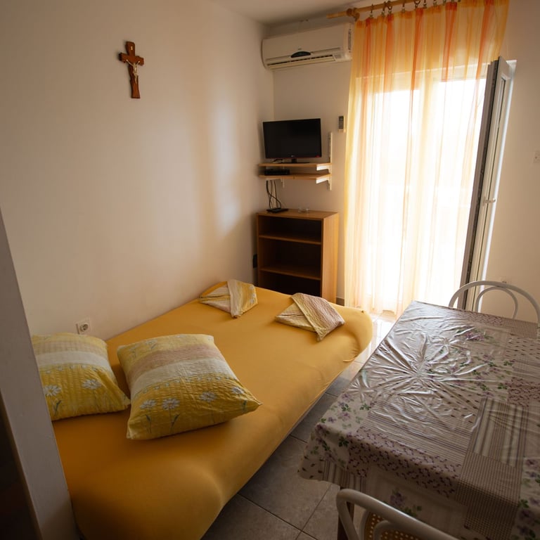 Tento apartmán se nachází v prvním patře a má ložnici se dvěma lůžky, obývací pokoj s kuchyní a manželskou postelí, balkon na šířku apartmánu s posezením a výhledem na moře, koupelnu a klimatizaci. Ubytuje až 4 osoby s neomezeným a bezplatným používáním klimatizace. V kuchyni je elektrický sporák a trouba, lednice 120L s mrazákem 10L, mikrovlnná trouba, rychlovarná konvice. Hosté mají přístup ke sklenicím, šálkům, nádobí, hrncům, pánvím, ručníkům a všem nezbytným kuchyňským potřebám. Check-in je od 14:00 v den příjezdu a check-out je do 10:00 v den odjezdu. Ceny jsou uvedeny v € za apartmán a noc, bez dalších nebo skrytých poplatků. Pobytová taxa, klimatizace, teplá voda, elektřina a Wi-Fi jsou zahrnuty v ceně. Počet hostů nemá vliv na cenu.