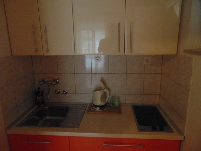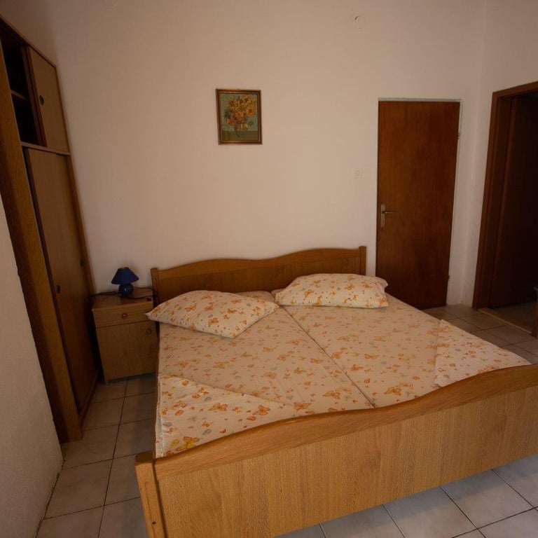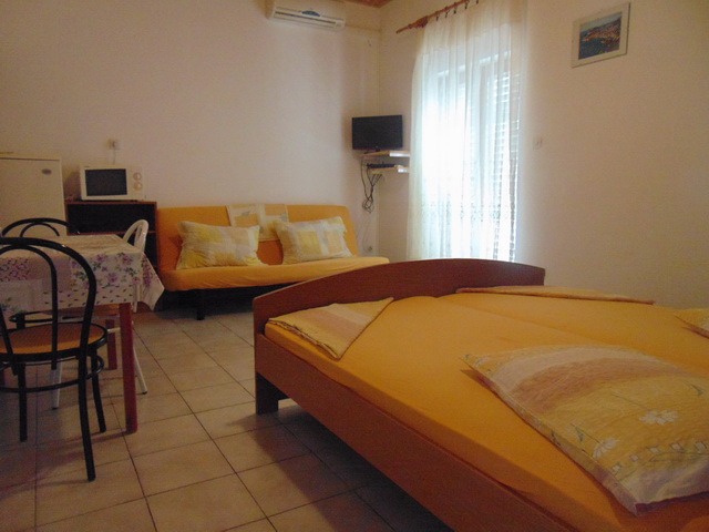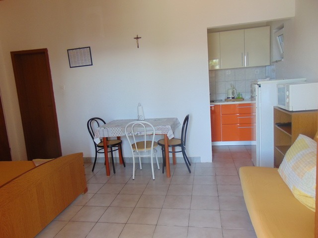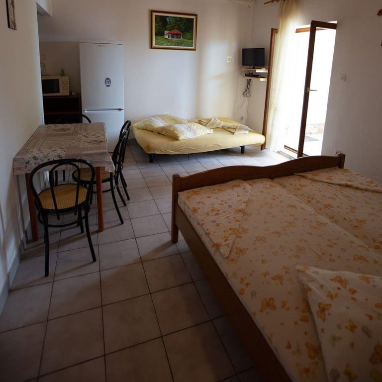 Ten apartament typu studio położony jest na parterze i oferuje otwartą przestrzeń mieszkalną z jednym łóżkiem podwójnym i dodatkowym łóżkiem składanym. Balkon o pełnej szerokości zapewnia część wypoczynkową i niesamowity widok na morze. Apartament obejmuje prywatną łazienkę i w pełni wyposażoną kuchnię z kuchenką elektryczną, piekarnikiem, lodówką 120 l, zamrażarką 10 l, kuchenką mikrofalową i czajnikiem elektrycznym. Goście będą mieli dostęp do wszystkich niezbędnych przyborów kuchennych, naczyń, szklanek, naczyń kuchennych i ręczników. Klimatyzacja jest nieograniczona i bezpłatna. Apartament jest dostępny od godziny 14:00 w dniu przyjazdu do godziny 10:00 w dniu wyjazdu. Stała cena za noc dotyczy całego apartamentu, niezależnie od liczby gości i obejmuje klimatyzację, ciepłą wodę, prąd, internet i podatek turystyczny, bez dodatkowych lub ukrytych opłat.