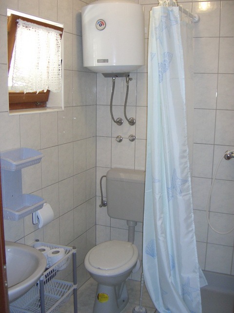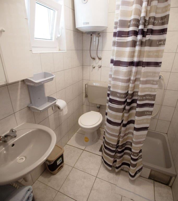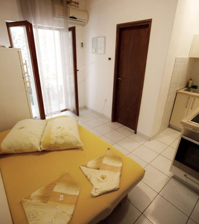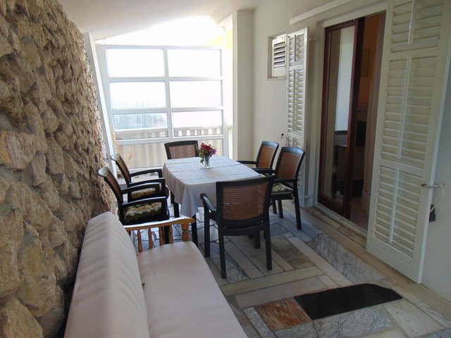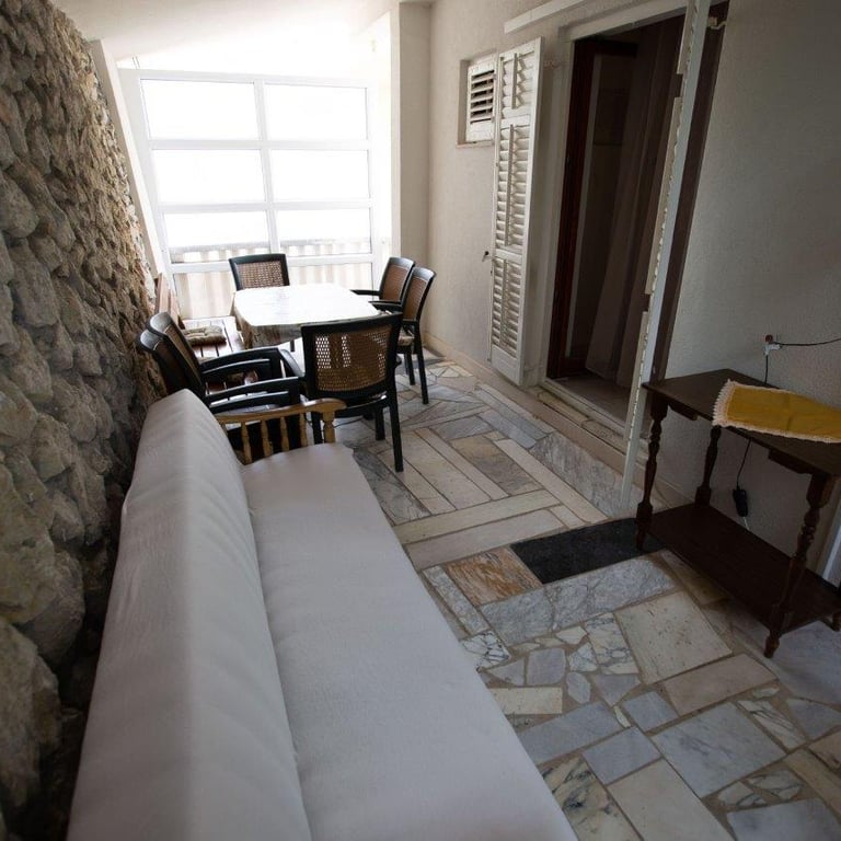 This first-floor apartment includes two bedrooms with four double beds, a living room with a kitchen and a fold-out bed for two guests, a balcony extending across the entire apartment with seating, two bathrooms with two toilets, and air conditioning. The kitchen is fully equipped with an electric stove and oven, a 120L refrigerator with a 10L freezer, a microwave, and a kettle. Guests have access to glasses, cups, cookware, pots, pans, towels, and other necessary kitchen essentials. The number of guests does not affect the price. Air conditioning, hot water, electricity, Wi-Fi, and the tourist tax are all included in the price, with no additional or hidden fees. Check-in is from 14:00 on arrival day, and check-out is by 10:00 on departure day. Prices are listed in € per apartment per night, with no additional or hidden fees. The tourist tax, air conditioning, hot water, electricity, and Wi-Fi are all included in the price. The number of guests does not affect the price